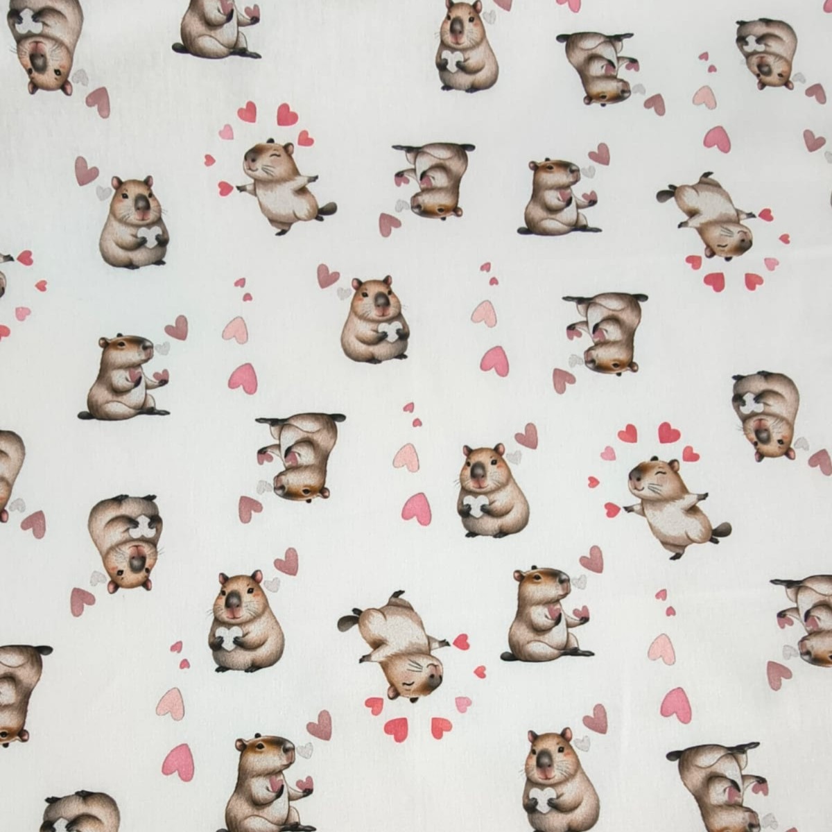 Tecido Tricoline Digital Capivaras e Corações Infantil - Ibirapuera - 50 x 150 cm