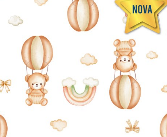 Tecido Tricoline Digital Ursinhos, Balões e Arco Íris fundo Off White - Ibirapuera - 50 x 150 cm