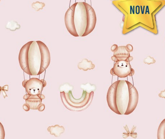 Tecido Tricoline Digital Ursinhos, Balões e Arco Íris fundo Rose - Ibirapuera - 50 x 150 cm